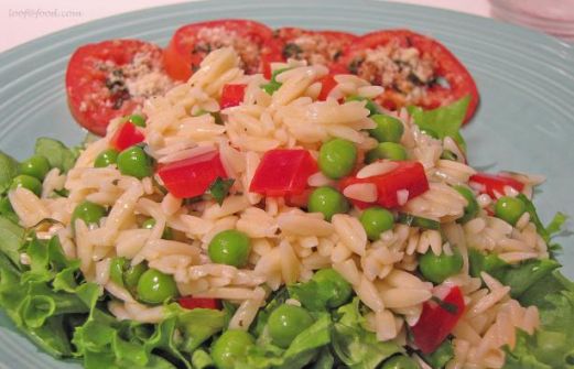 1 cup orzo (rice-shaped pasta) 1/4 cup cider vinegar 1/4 cup vegetable oil 1 teaspoon Dijon mustard 1/2 teaspoon dried basil 1/4 teaspoon salt 1/8 teaspoon pepper 1 cup frozen green pea , thawed 4 gree [...]