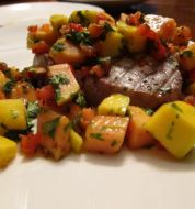 1/4 cup olive oil 4 tablespoons lime juice , fresh squeezed 1/2 cup reduced sodium soy sauce 1 1/2 tablespoons ginger , minced fresh 3 teaspoons garlic paste 4 tuna steaks , 1 in thick 2 mangoes , ripe, peeled and diced [...]