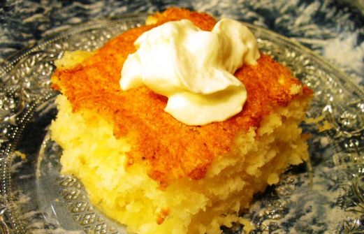 1 16-ounce box angel food cake mix 1 20-ounce can crushed pineapple in its own juice, undrained Optional topping: Powdered sugar or whipped topping Heat oven to 350̊ F. Dump cake mix and undrained pineapple into an ungreased 9" x 12" baking pan. Stir together unt [...]
