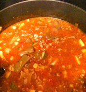 1 lb ground beef , browned 1 onion , chopped 1 large baking potato , diced 3 ribs of celery , chopped 3 cloves garlic , minced 1 tomato , diced 1 jalapeno , chopped 1 12-oz bag frozen corn 1 12-oz bag frozen peas & carrots 1 16 oz can chicken stock 1 8 oz c [...]