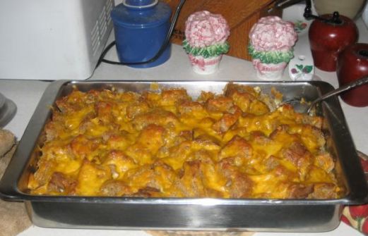 1 lb hamburger 8 slices bread, cubed 1 lb sharp cheddar cheese , shredded 6 eggs 3 cups milk 1 teaspoon dry mustard 1 teaspoon salt 1 Brown hamburger and drain. 2 Spread the browned meat in the bottom of a 9& [...]