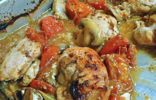 8 large chicken breast halves 4 large tomatoes , quartered 1 (8 ounce) package fresh mushrooms 1 (8 ounce) bottle Italian dressing 1 (1 1/4 ounce) package Lipton Onion Soup Mix 1/2 teaspoon oregano leaves , crushed 1 bay lea [...]