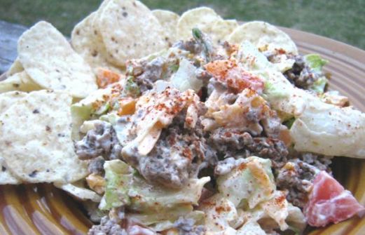 1 head lettuce 1 1/2 lbs hamburger , broken into bite size and cooked 1 medium size onion , chopped 1 green pepper , chopped 1 cup cheddar cheese , shredded 4 -6 tomatoes , chopped 2 (15 1/2 ounce) cans chili beans , rinsed [...]