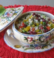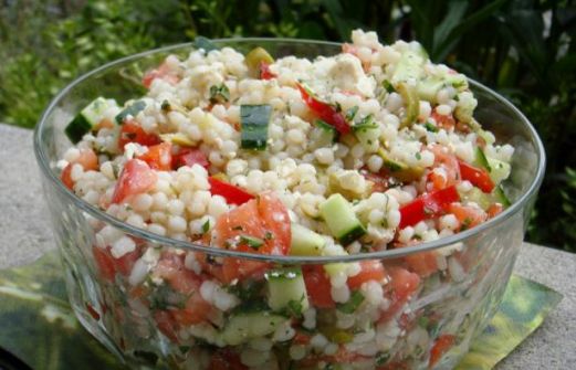 1 (8 7/8 ounce) package israeli couscous 1/2 medium cucumber , peeled and diced 2 medium tomatoes , seeded and chopped 1/4 cup red bell pepper , diced 2 -3 green onions , sliced 10 black olives , sliced 6 ounces fat free fet [...]