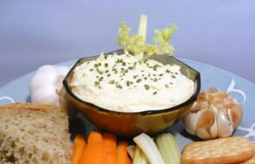 1 whole head of garlic , roasted 8 ounces fat free cream cheese , softened 1 Squeeze cloves of roasted garlic out and place it in a food processor with the softened cheese. 2 Pulse until smooth and creamy.