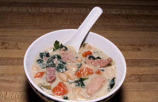 1 cup ham , diced 1/4 cup onion , diced 1/4 cup celery , diced 1/4 cup carrot , diced 1 tablespoon garlic , minced 1/2 tablespoon butter 1/2 tablespoon olive oil 2 (14 1/2 ounce) cans chicken broth 1 teaspoo [...]