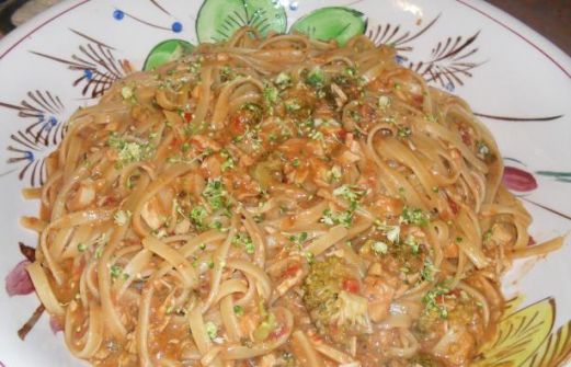 1 cup picante sauce 1/4 cup peanut butter 2 tablespoons honey 1 tablespoon soy sauce 1/2 tablespoon ground ginger 3 cups cooked fettuccine 2 cans cooked chicken 1 red bell pepper , chopped 2 tablespoons [...]