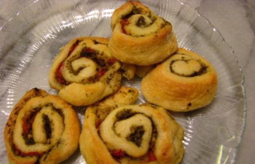 1 (8 ounce) can refrigerated crescent dinner rolls 1/3 cup prepared pesto sauce 1/4 cup roasted red bell pepper , chopped 1 Heat oven to 350F degrees. 2 Unroll dough into 2 rectangles. 3 Firmly press on perforations to seal them. 4 Spread rectan [...]