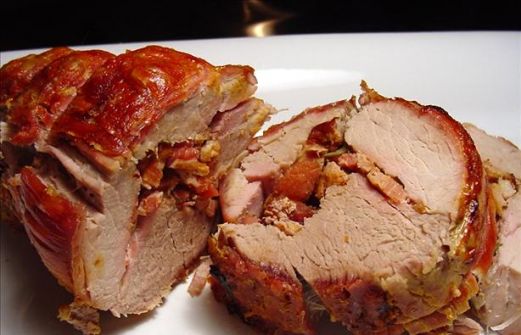 4 slices bacon 2 garlic cloves 1 teaspoon dried rosemary 3 lbs boneless pork loin 1 Chop bacon. Mince garlic. 2 Crush rosemary and combine with bacon and garlic. 3 Cut pork loin lengthwise almost all the way through middle, leaving 1/4 [...]