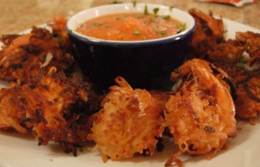 25 cocktail shrimp 1 egg 1/2 cup half-and-half 1/3 cup flour 1 cup shredded sweetened coconut 1/2 cup vegetable oil 4 ounces crushed pineapple , in its own juices 1 small red sweet bell pepper 1 teaspoo [...]