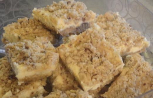 1/3 cup packed brown sugar 1/2 cup chopped walnuts 1 cup flour 1/3 cup melted butter 1 Mix crust ingredients together until crumbly. 2 Reserve 1 cup of mixture for topping. 3 Press firmly in 8" pan. 4 Bake 12-15 minutes at 350. [...]