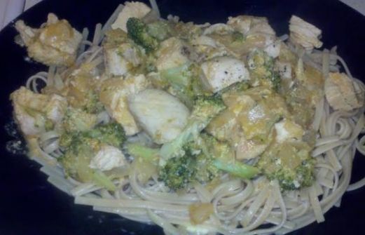 8 ounces whole wheat linguine 4 boneless skinless chicken breast halves , cut into bite sized pieces 1/2 teaspoon salt 1/4 teaspoon black pepper 1 large onion , chopped 1 garlic clove , minced 3/4 cup chicken broth 2 [...]