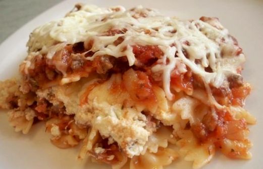 8 ounces bow tie pasta , farfalle 1 tablespoon oil 1 small onion , chopped 8 ounces lean ground beef or 8 ounces turkey 1 (14 ounce) jar spaghetti sauce, your choice 1 cup ricotta cheese or 1 cup low fat cottage cheese [...]