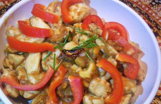 1/4 cup oil 4 garlic cloves , minced 1 lb chicken , thinly sliced 1/2 cup roasted cashew nuts 1 green onion , chopped 1/4 cup sliced red bell pepper 1 Heat a large skillet then add the oil, garlic, chicken, the sauces, sugar [...]