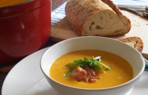 700 g butternut pumpkin, peeled, chopped 1 tablespoon olive oil 1 red onion , chopped 2 garlic cloves , minced 3 cups chicken stock salt & pepper 1 cup light cream 5 slices middle bacon , chopped, pan fried fresh pa [...]