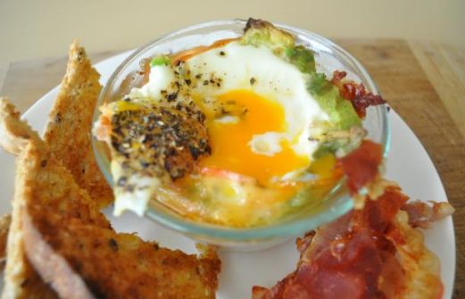1 tablespoon unsalted butter 4 slices prosciutto (thin slices) 1 tablespoon parmesan cheese 1 Avocado , peeled and cut into 1/2-inch slices 2 tablespoons sour cream 4 eggs salt and pepper 1 tablespoon basil , choppe [...]