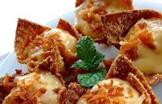 1/2 cup sugar, plus 2/3 cup sugar 1/2 cup graham cracker crumbs 12 egg roll wraps, stacked and cut into 48 squares 6 tablespoons butter, melted, plus 2 tablespoons butter for custard 3/4 cup sweetened coconut flakes [...]