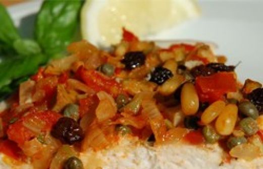 3 ounces raisins 5 tablespoons olive oil 1 small onion, minced 1 clove garlic, minced 1/2 pound ripe tomatoes, diced 10 green olives, pitted and minced 2 ounces pine nuts 1/4 cup capers 2 pounds sw [...]