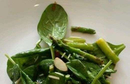 1/4 cup olive oil 1/8 cup lemon juice 12 fresh asparagus spears 6 cups fresh spinach leaves 1/8 cup grated Parmesan cheese 1 tablespoon seasoned slivered almonds