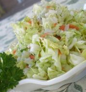 Thinly slice the cabbage in a mandolin and place in a bowl. Cut the onion in half and then cut into thin slices. Add to the bowl. Grate the carrot using the large blades of a cheese grater. Add to bowl. Thinly slice the celery and add to the bowl. Finley chop the parsley and add to the b [...]