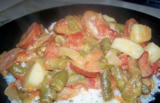 1 lb smoked sausage (I always use Eckrich Skinless Smoked Sausage) 1 cup chopped onion 1 teaspoon oil 1 (14 1/2 ounce) can del monte diced tomatoes (undrained) 1 (29 ounce) can del monte cut green beans with new potatoes, drained 1 -2 te [...]